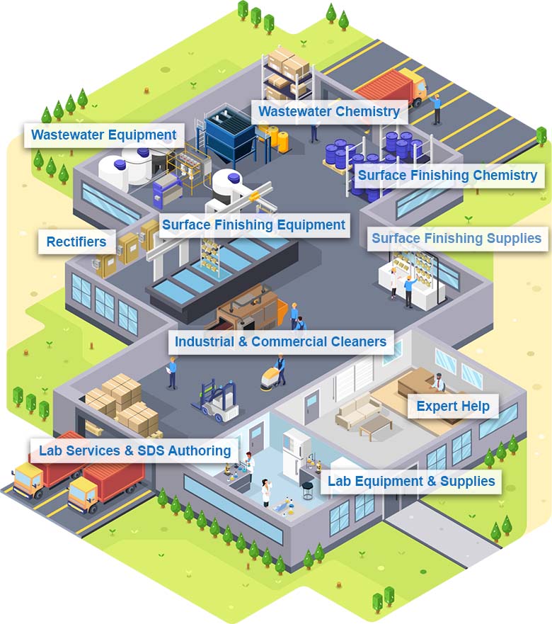 We are an ISO 9001 chemical blender of our own line of industrial cleaners, specialty chemicals, and environmental products for use in the surface & metal finishing industries like plating, anodizing, phosphating, chem film, electroless nickel, electropolish, pre-powder/paint and many other industrial manufacturing processes.